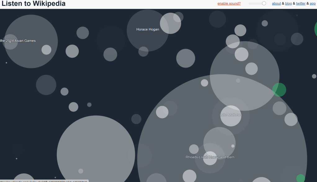 We all know Wikipedia, chances are we all use it too. Even so, it’s hard to have a good idea of how much Wikipedia lives, moves, and this is why Hatnote, two men passionate about Wikipedia, created this tool. Each change in Wikipedia can be heard: bells or strings welcoming newcomers and edits, creating a strange but very soothing melody that helps understand how quickly data is updated. You can also read more about the project or spend too much time browing the collection they made, to visualise Wikipedia in many surprising ways!